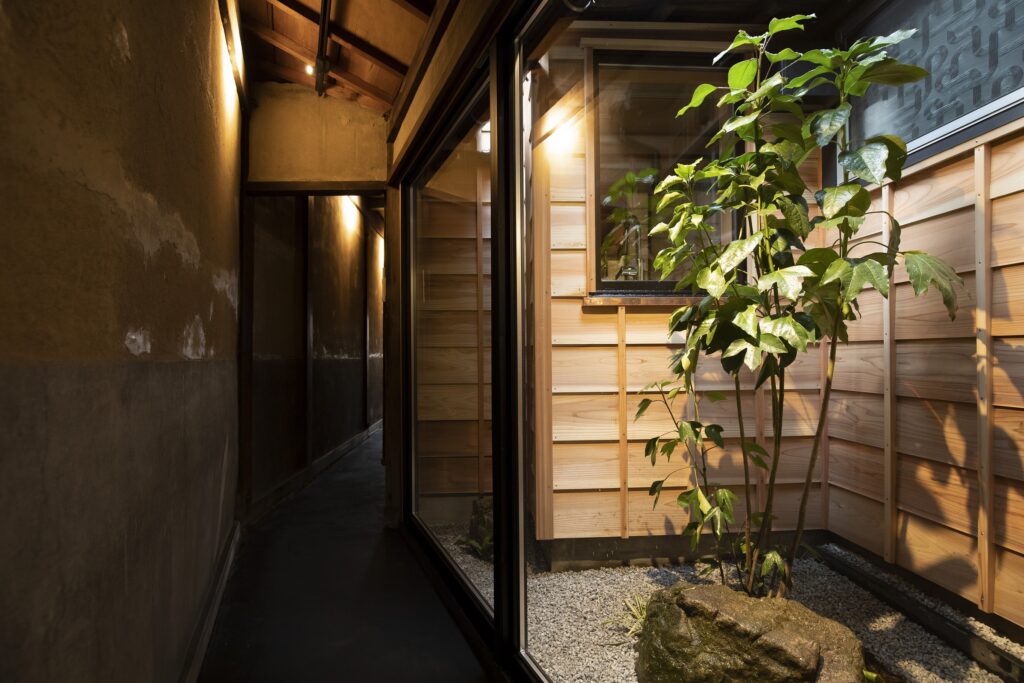 調度品はほぼアンティーク! トオリニワと呼ばれる、細長く屈曲して伸びる土間廊下は、夜になると幻想的です。